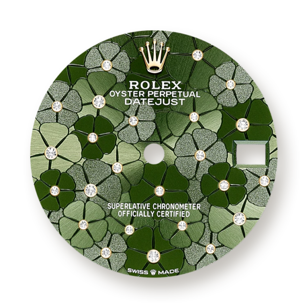 - Dial color: Olive green dial with floral motif and 24 Diamonds in 18k Yellow Gold settings
